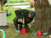 Под окнами дома 98 по улице 30 лет ВЛКСМ ежедневно кипит работа.  Мужчины обустраивают клумбы и декоративные элементы. Молодые люди недавно переехали в город. Началось все с двух лебедей, потом сделали медведя, затем идеи стали воплощаться в жизнь