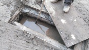 Пробить засоры в трубах водоотводных каналов пока не удается. Внутри ливнёвок всё ещё не растаял лёд, скомковавшаяся замёрзшая грязь словно камень.