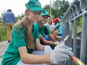 Волонтеры покрасили пешеходный мост в Березовой роще в корпоративном стиле СУЭК