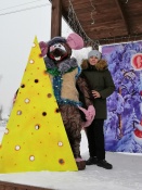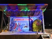 Через мобильную группу организовали сбор средств на украшение сцены. Решено было заказать красивый баннер с новогодней открыткой и приобрести цветные гирлянды. Теперь в вечернее время сцена создает праздничное настроение. Там же установили большие часы и символ года- двухметровую мышь с куском сыра. Изготовили эти атрибуты своими руками жительницы поселка. Автор мыши Виктория признается, приложено немало сил и фантазии. Ушел и весь подручный материал. Чтобы доставить фигуру на место потребовалась помощь супругов Сергея и Евгении.
