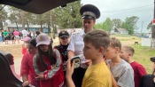 Александр Карзов, начальник МО МВД России «Назаровский»: «Каждый сезон сюда приезжаем, для того чтобы дети почувствовали, что в Росси есть полиция. Мы рассказываем, как мы работаем, показываем свою технику, некоторые виды вооружения привезли, образцы специальных средств, бронежилеты, наручники, палки резиновые, для того чтобы детям показать, что сегодня полиция это не просто дяденьки в форме которые ходят по городу, а это сила, которая обеспечивает сегодня безопасность в Российской Федерации».