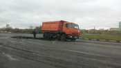 На автомобильном кольце дороги Назарово-Ужур, в районе Кемпинга, водитель грузового автомобиля устраняет последствия небольшого происшествия. По всей видимости, во время поворота открылся правый борт грузовика и большинство груза высыпалось на